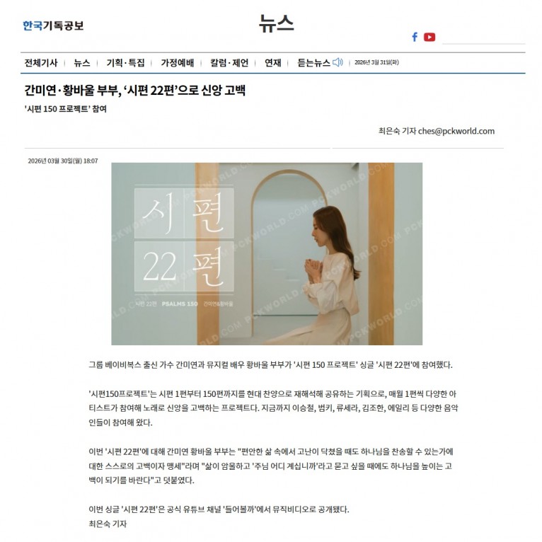[기사] 간미연·황바울 부부, ‘시편 22편’으로 신앙 고백(한국기독공보)