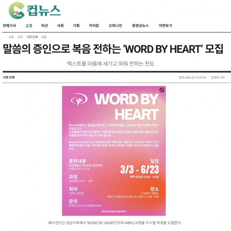 [기사] 말씀의 증인으로 복음 전하는 ‘WORD BY HEART’ 모집(크리스챤연합신문 컵뉴스)