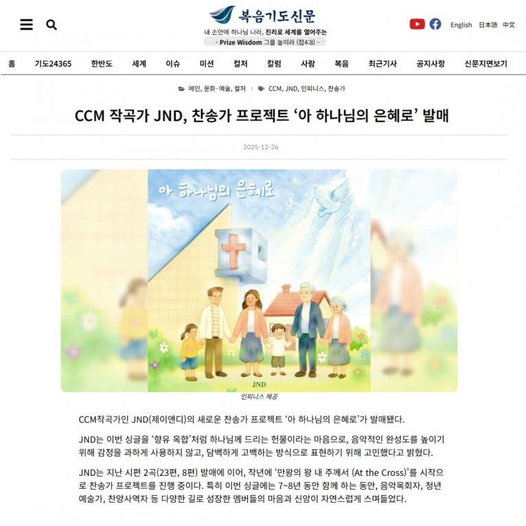 뮤직타임 [기사] CCM 작곡가 JND, 찬송가 프로젝트 ‘아 하나님의 은혜로’ 발매(복음기도신문)